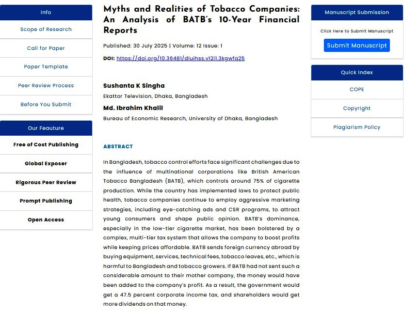It was a fruitful workshop with 30 agricultural journalists, where I had the opportunity to share insights on tobacco control issues at a special session held on Wednesday, 5 November 2025, at the Bureau of Economic Research (BER), University of Dhaka. I presented the keynote paper titled “Corporate Aggression Fuelling Tobacco Cultivation: A Threat to […]